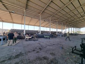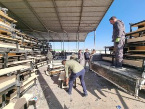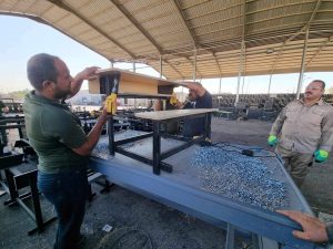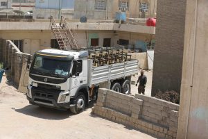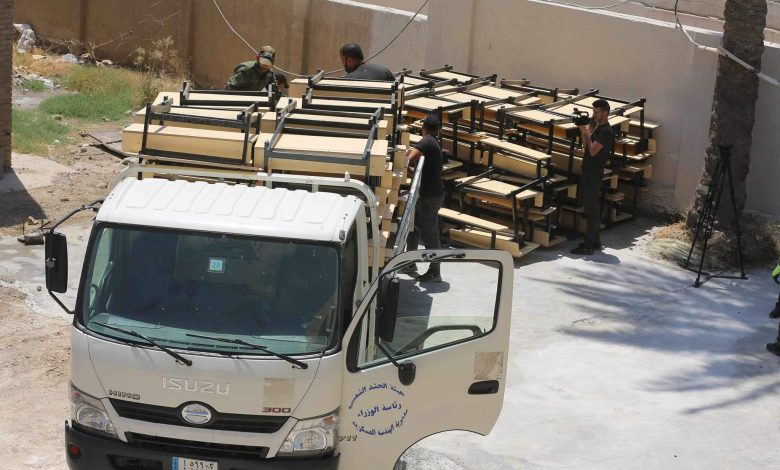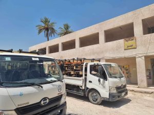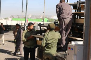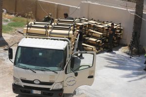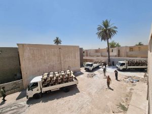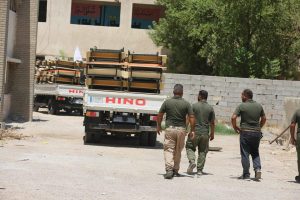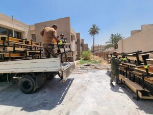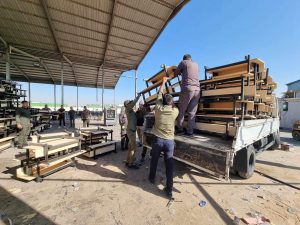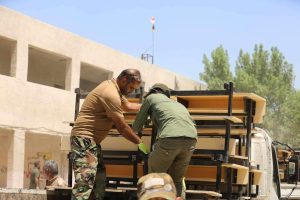 جهز الجهد الخدمي والهندسي الحكومي / معمل تصنيع رحلات الحشد الشعبي مخازن وزارة التربية بالمقاعد الدراسية لمنطقة النهروان في اطراف بغداد.