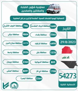 حيث تم معالجة 54273 حالة طبية موزعة على 13 محافظة وهي كربلاء المقدسة بواقع 1648 حالة و النجف الأشرف 746 حالة كما عالجت مفارز المعاونية في العاصمة بغداد 2566 حالة طبية كما شهدت محافظة ديالى وكركوك 16294 حالة طبية واستقبلت المفارز الطبية في معاونية الطبابة بمحافظة صلاح الدين 14174 حالة، فيما وصل عدد الحالات الطبية في مفارز معاونية شؤون الطبابة في محافظات الفرات الأوسط وتحديدا في محافظة بابل وواسط والديوانية وذي قار والمثنى إلى 14218 حالة بالإضافة إلى 2364 و 2264 حالة في محافظتي البصرة وميسان.
