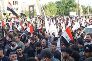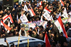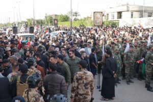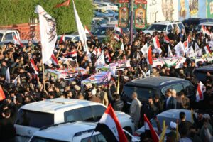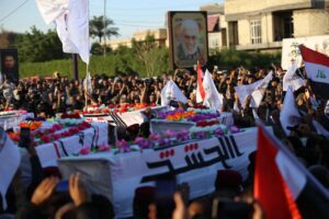 وقد انطلق موكب التشييع المهيب للجثامين الطاهرة للشهداء السعداء في منطقة شارع فلسطين وسط بغداد وسط تنديدات بالقصف الأميركي الغادر الذي مثل انتهاكا سافرا للسيادة العراقية.
