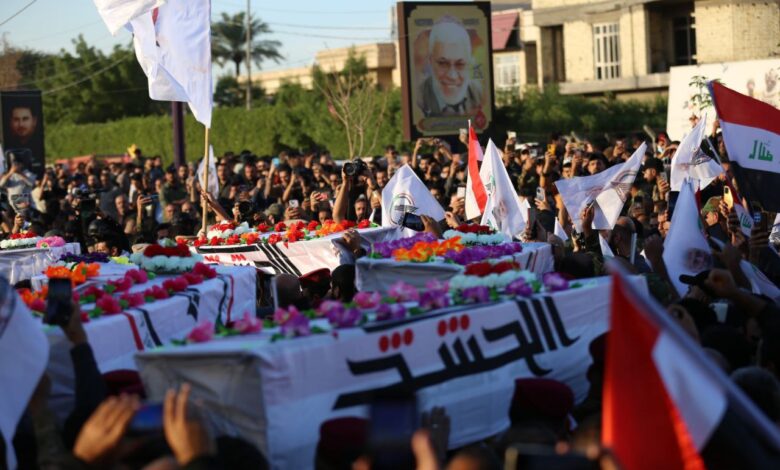 هيئة الحشد الشعبي تقيم تشييعا مهيبا لجثامين شهداء القصف الأميركي الغادر في جرف النصر