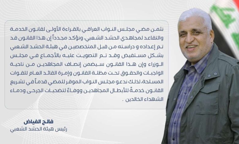 نثمن مضي مجلس النواب العراقي بالقراءة الأولى لقانون الخدمة والتقاعد لمجاهدي الحشد الشعبي، ونؤكد مجدداً إن هذا القانون قد تم إعداده و دراسته من قبل المتخصصين في هيئة الحشد الشعبي بشكل مستفيض وقد تم التصويت عليه بالأجماع في مجلس الوزراء وإن هذا القانون سيضمن إنصاف المجاهدين من ناحية الواجبات والحقوق تحت مظلة القانون وإمرة القائد العام للقوات المسلحة، لذلك ندعو مجلس النواب الموقر للمضي قدماً في تشريع القانون خدمةً للأبطال المجاهدين ووفاءً لتضحيات الجرحى ودماء الشهداء الخالدين.